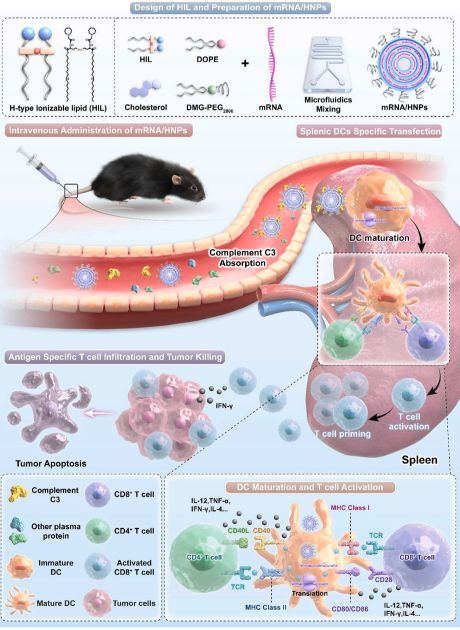 近些年来,mRNA疗法在诸多疾病治疗领域已成为一种革命性的治疗手段。其中,以脂质纳米颗粒(Lipid Nanoparticles, LNPs)作为mRNA递送载体已在感染性疾病(如COVID-19、RSV等)的预防中取得显著成功。然而,在肿瘤免疫治疗领域,如何将mRNA精准递送至脾脏这一关键免疫器官,特别是靶向其中的树突状细胞(DC),以高效激活机体特异性抗肿瘤免疫应答,仍是一个亟待解决的挑战。